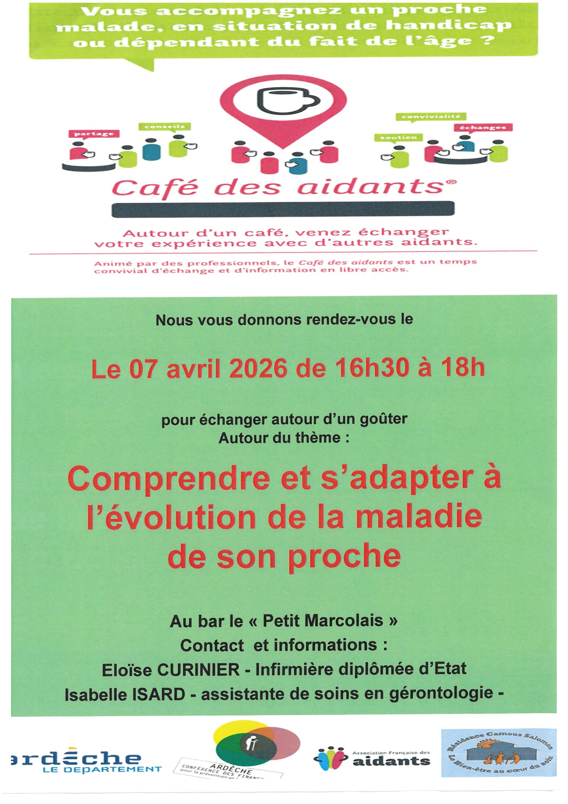 Le prochain café des aidants aura lieu le 07 avril 2026 au bar le <<Petit Marcolais>>.