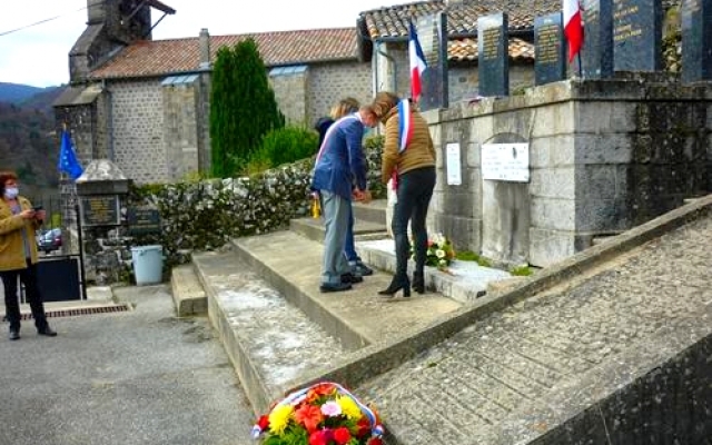 Il est précisément 11 heures, quand aux côtés de Monsieur Bernard Justet, Maire de Marcols les Eaux, Anne-Marie Roudil, Adjointe, et Sabine Vialle, Conseillère municipale, déposent une gerbe en hommage aux soldats de la Grande Guerre.